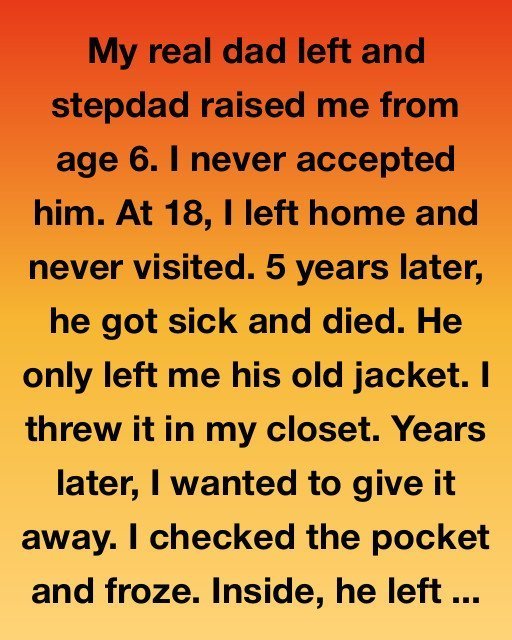 Years later, I wanted to give it away. I checked the pocket and froze. Inside, he left a folded letter with my name written in blocky, uneven handwriting.