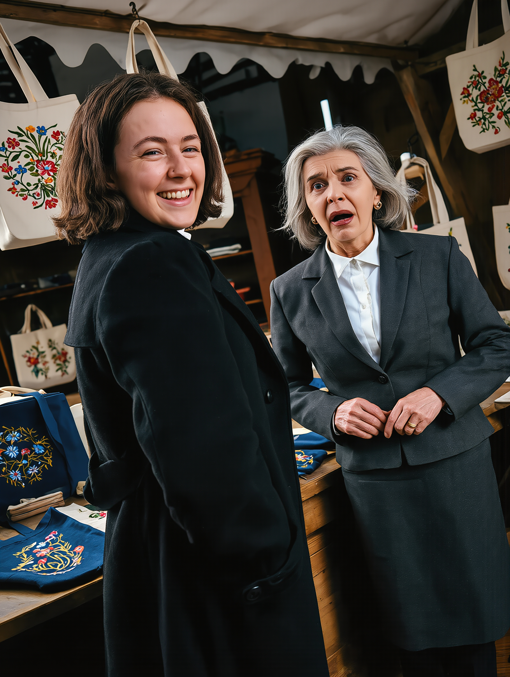 “Tote bags, Mom!” she said without looking up. “Reusable ones. So every dollar goes straight to families who need winter clothes.”