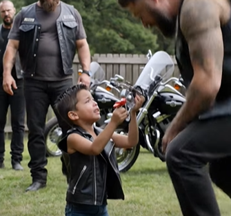 The boy pointed at the toy motorcycle in the biker’s hand.